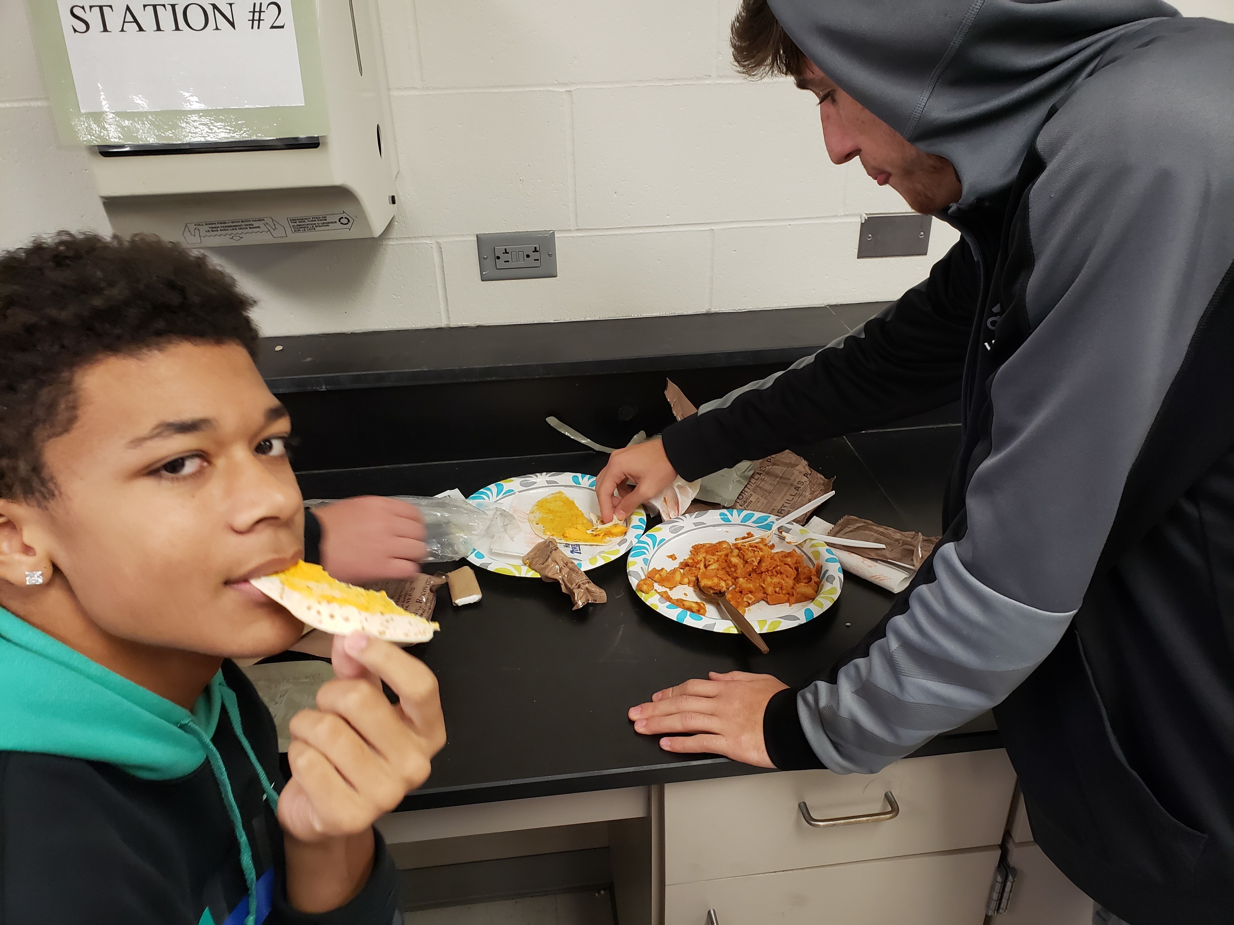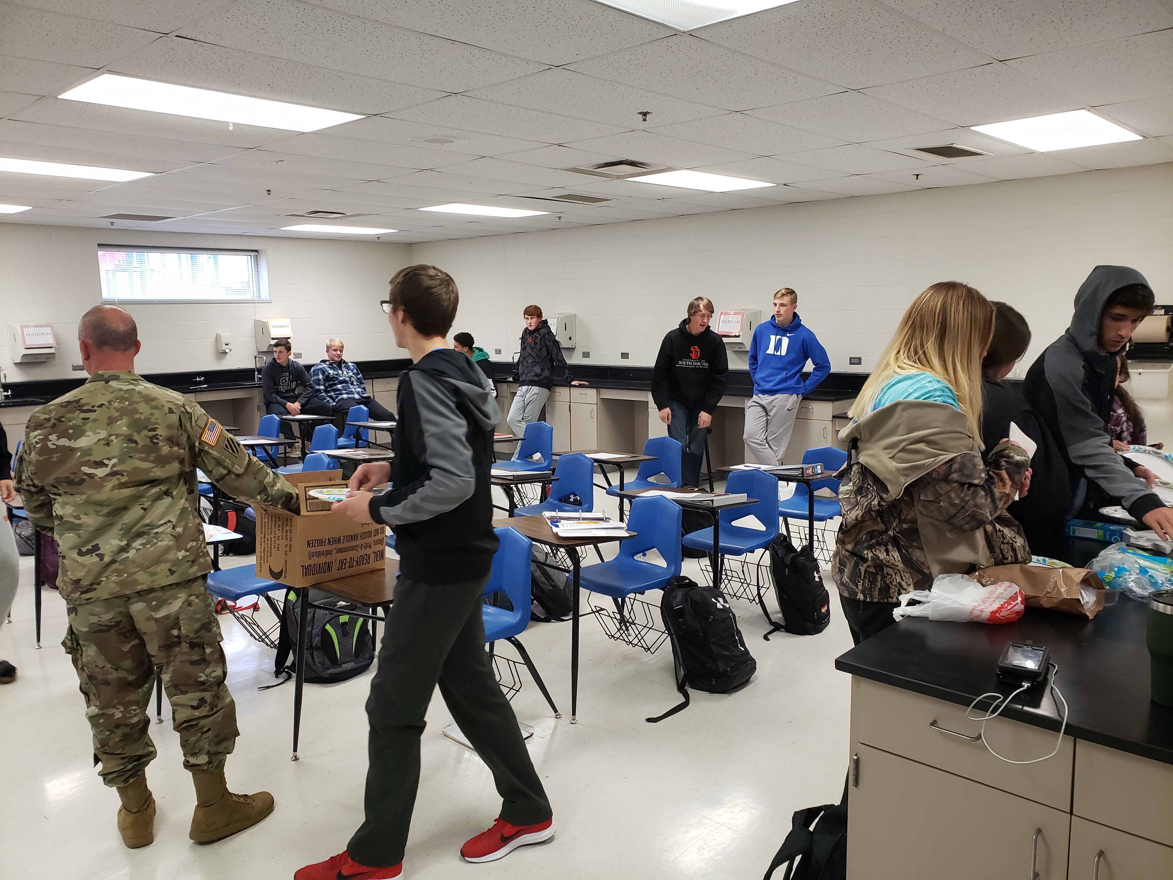 SSG Heier recently visited the applied chemistry class to talk about the chemistry of MREs (meals ready to eat). Students were asked about exothermic reactions and the basic chemical components of a chemical reaction. At the end of the lesson, the students were able to cook and try their very own MREs courtesy of the South Dakota National Guard.